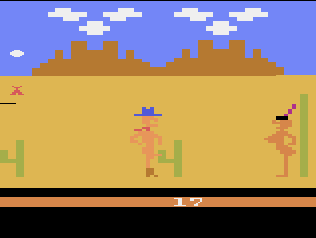 Probably more infamous than any other game on the list, “Custer’s Revenge” stars the reanimated corpse (or so we can only assume) of General George Armstrong Custer, trying to stick it to Sitting Bull and Crazy Horse by sticking it to…well, you get the picture. The game simply asks you to take control of Custer, decked-out in his Union Army hat, boots, and all the glory God gave him, and walk across the screen to an excited-looking Native American girl with scolioses, likely caused by a top-heavy physique. The catch? Much like the girl, Sitting Bull won’t take it lying down, and Custer must dodge a rain of arrows on his way to commit miscegenetic fornication. While…uh…engaging the young woman…against a cactus…Custer must occasionally…”withdraw from the battle”…as the arrows keep flying in, and the game wants you to keep pounding…uh, the action button until the deed is over.