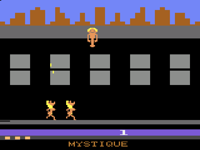 In Burning Desire and Jungle Fever, you play as a man or woman dangling from a helicopter, trying to rescue people from two pillars of flame, slowly closing in on their location, while two jungle monsters lob rocks (or something) at you. Yet for some reason, you flew out here au naturel, and don’t seem to have the wits to fight the fire with anything other than your least efficient bodily fluids. At least, the game’s material tells you the characters spray the flames with ejaculate and milk. One may want to tell Mystique that their depiction of the droplets coming from above the characters’ necks actually tames down the perversion of the game.