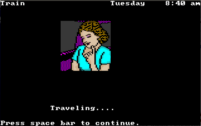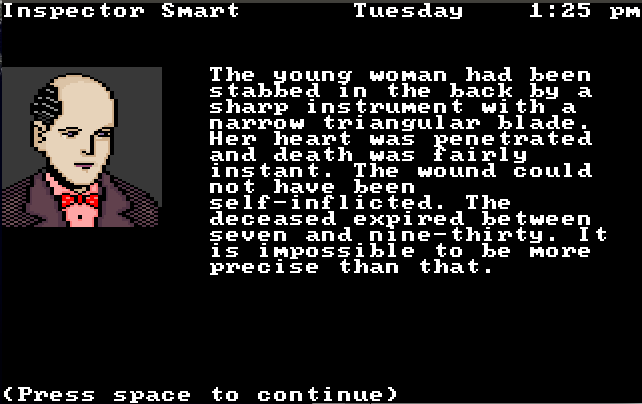 See, The Scoop, a precursor to point-and-click adventure games released for Apple in 1986 and DOS in 1989, takes its plot from a novella written (in part) by Agatha Christie. It tells the story of either a male or female reporter at a down-on-its-luck newspaper that spies an opportunity to increase readership by capitalizing on a recent murder. Which, very shortly after the game begins, becomes two murders. The reporter travels to various locations in England, talking to people, spying on people, searching for physical evidence, and showing said evidence to said people in order to evoke interesting and insightful responses. The player has five in-game days to pilfer as much junk from the scenery as possible and locate the people who may find it interesting. If the player can show the proper items to the proper people, they’ll all converge on a single spot on Saturday afternoon to reveal the murderer’s identity. Oh, and presumably in order to accomplish this you have to solve the mystery.