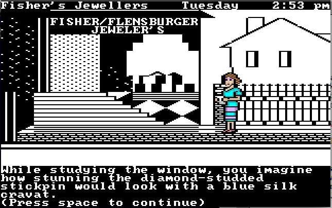 But in a game, the murder mystery format doesn’t work. Some times the clues simply don’t flow together logically and the player can only solve the mystery by trial-and-error. So while most games should have replay value, The Scoop forces you to replay it. Or, if you’ve solved the mystery, you don’t really have any reason to play it again. So with a bigger brain than my 10-year-old self and a finer understanding of mysteries (thanks to an amazing Neil Simon film, “Murder by Death.” Go watch it. Now. I’ll wait…) I zeroed in on the details I missed before, followed the people with the most likely motive, figured out that two of the characters conspired to murder over a bag of jewels…and then followed the walkthrough until a character with almost nothing to do with the story leaped off a building to avoid going to jail.