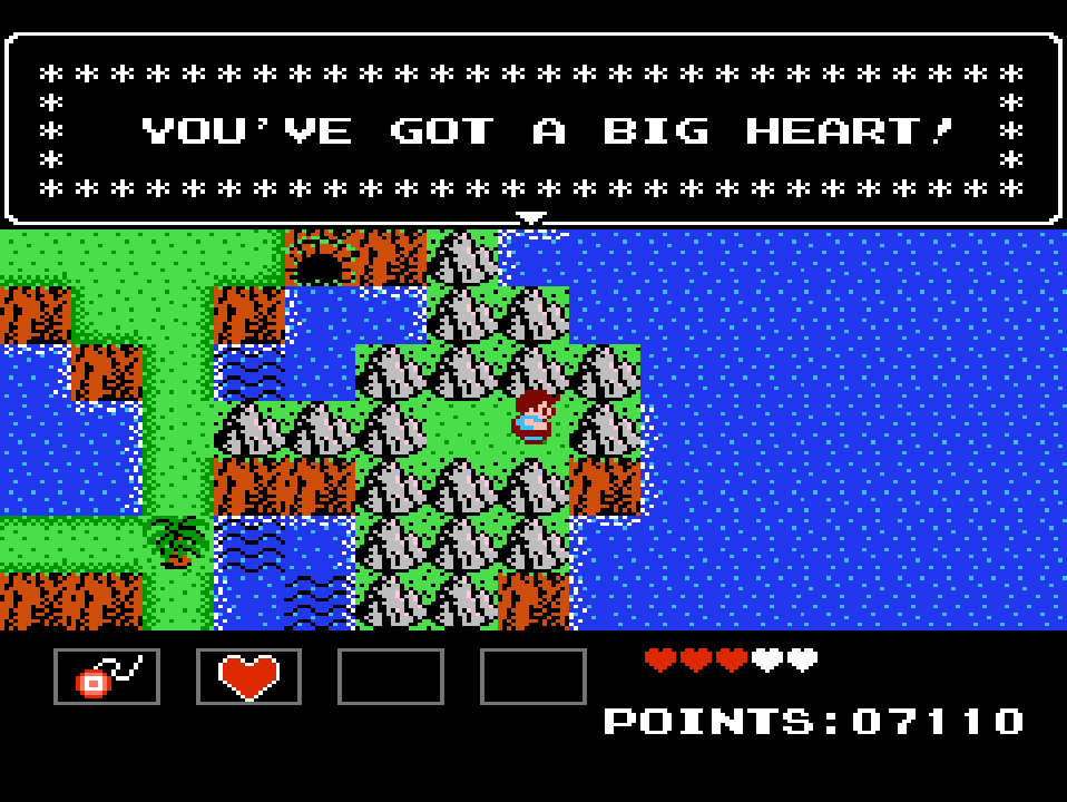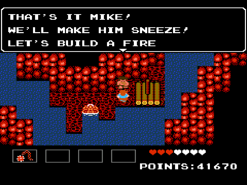 One of the less-fortunate features carried over from the Legend of Zelda gave me no end of problems and eventually broke me down to the point of using save states to cut back on endless hours of repetition. Although Mike’s life meter grows every time he discovers a big heart, his cardiomegaly apparently takes its toll on his health as he starts each new life afresh with three whopping hearts. I didn’t like this in Zelda, but at least enemies in that game had the common decency to offer you their still-beating hearts as you ripped them from their chests. Monsters in Star Tropics rarely pony up as organ donors, leaving the player to fend for himself at all costs in a perilous world of fast-moving enemies chasing after a protagonist with sluggish controls and pockets full of honey and snausages. Late in the game, as an effect of what I will generously call a glitch (well, more of a son-of-a-glitch), I picked up an item to increase my life gauge to full, after which it proceeded into a cut scene, saved the game, trimmed my life down to three hearts, then deposited me immediately in front of one of the major final bosses.